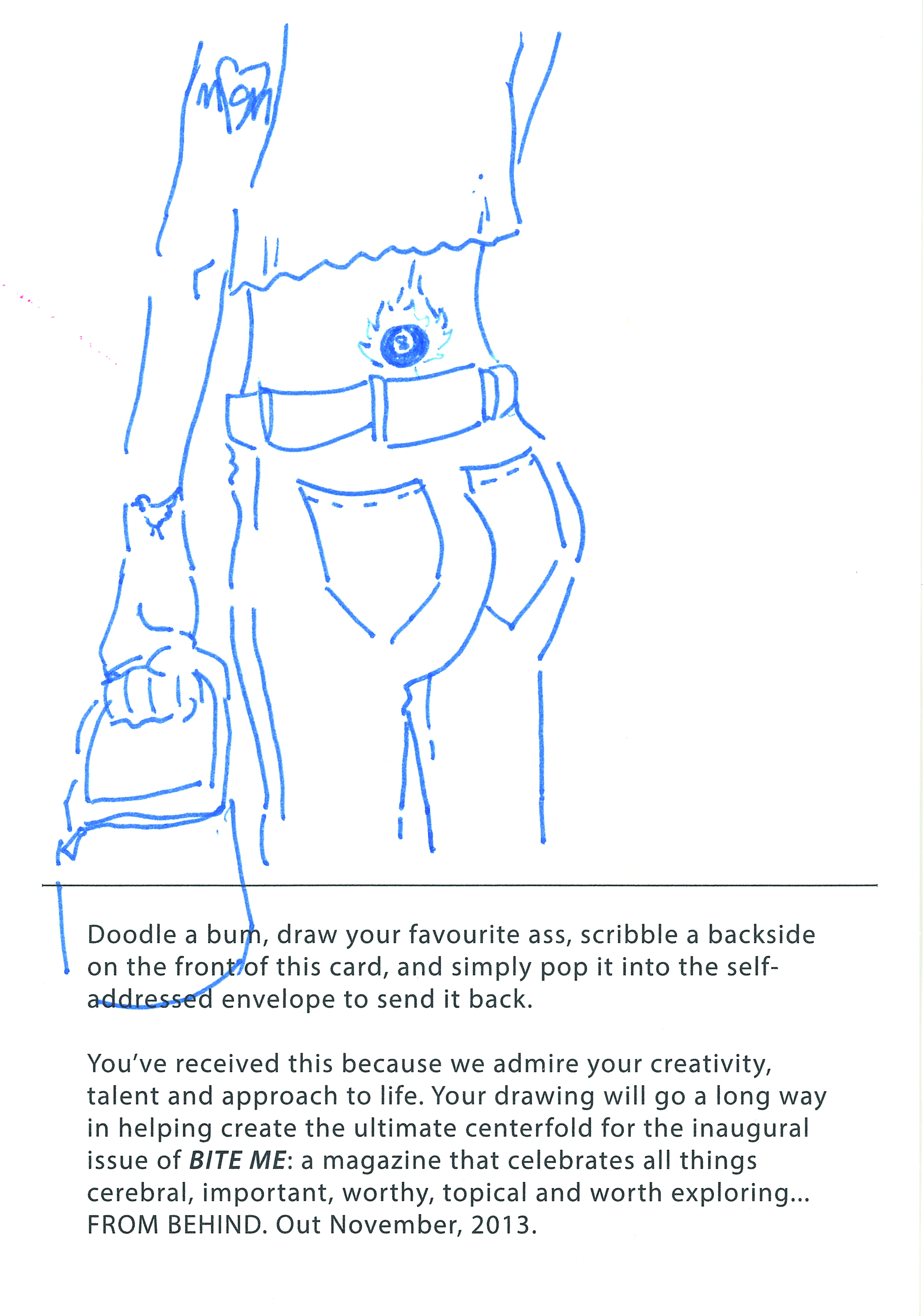 In the run-up to Issue 2 being released and cleaning up the digital odds and ends to make room on Dropbox, we came across our trove of brilliant hand-drawn submissions for the BUTT issue that didn’t make it into the print magazine. Here, for the first time, you can check out the varied places our minds go to when asked to draw a bum…